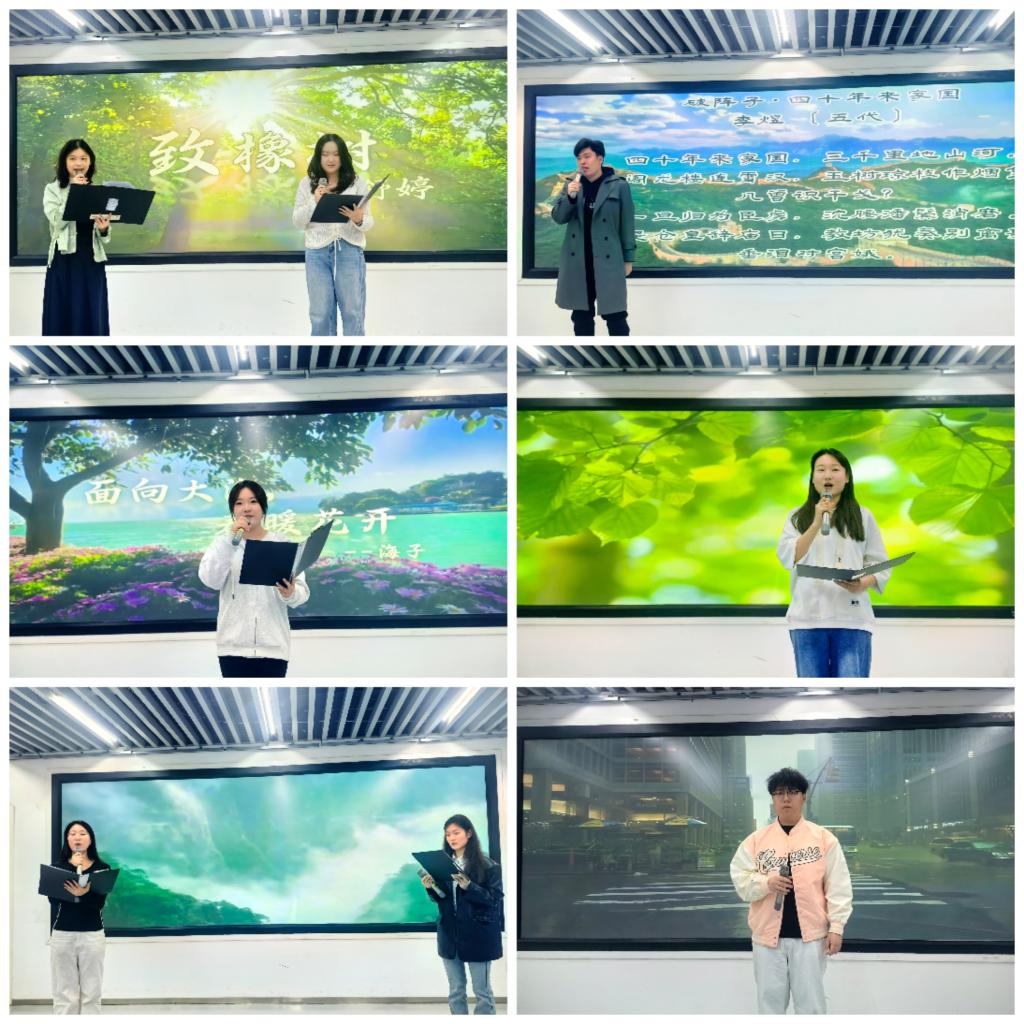 在经典诵读环节,同学们声情并茂演绎了经典书目的魅力。金虹同学诵读了《面朝大海,春暖花开》,用声音传递出温暖与希望;邱凤娇和曹静同学默契演绎了《致橡树》,展现出独立又美好的爱情观;蔡文瀚同学诵读了《破阵子·四十年来家国》和《浪淘沙·北戴河》,壮怀激烈,豪迈奔放;李玲莉同学朗诵了《青春》,充满激情的诵读点燃了同学们心中的青春之火。最后,袁明浩同学带来的音乐表演《安静》为活动增添了别样的艺术氛围。