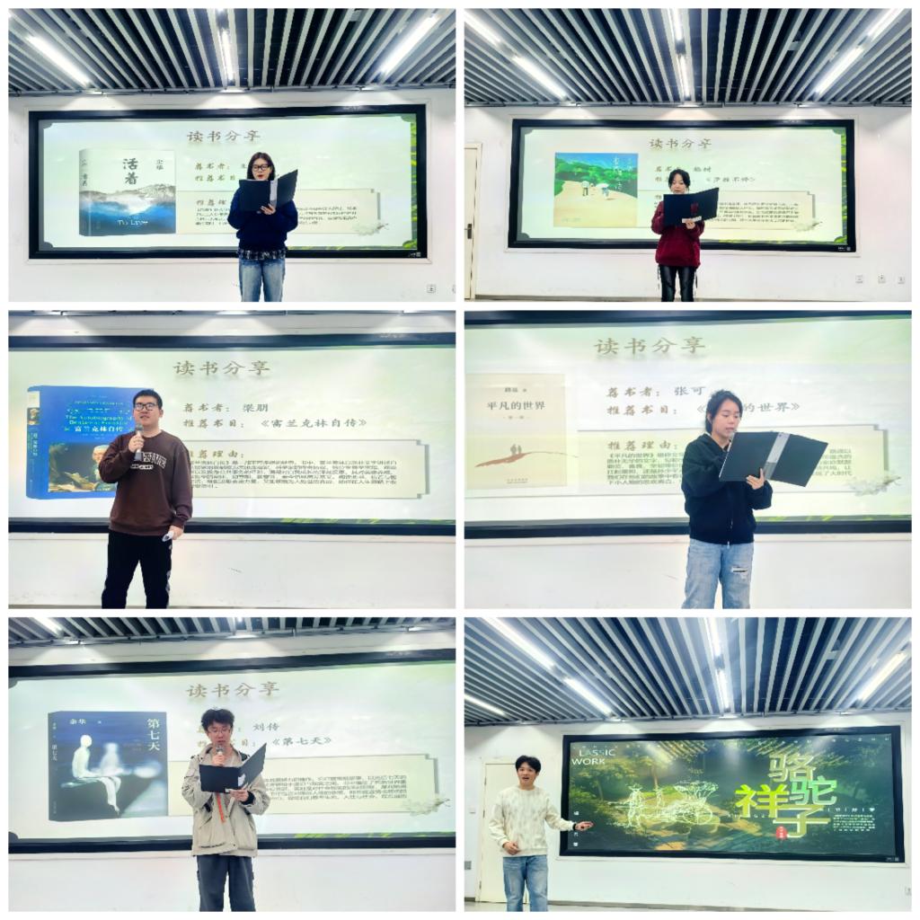在读书分享环节,同学们踊跃分享了自己钟爱的书籍。杨树同学分享了《步履不停》,告诉大家路就在脚下,人一生向前的脚步永不停息,要用心体悟生活里那些被忽视的温情。石现同学为大家解读了老舍先生的名著《骆驼祥子》,他说,这部作品像一柄解剖刀,剖开了三个维度的思考,让历史认知成为一堂“社会解剖课”;他在分享中通过旧社会与新时代的鲜明对比,号召同学们要筑牢理想信念的根基,锚定正确的方向,脚踏实地。接着,梁朋同学讲述了《富兰克林自传》中主人公的成长与智慧。张可同学分享了《平凡的世界》,带领大家共同体会平凡中彰显的伟大。同学们独到的见解与深刻的阅读感悟,让现场师生产生强烈共鸣:个体因为读书而有幸窥得万千个生命,拥有了一整个人类的力量。