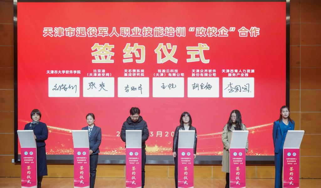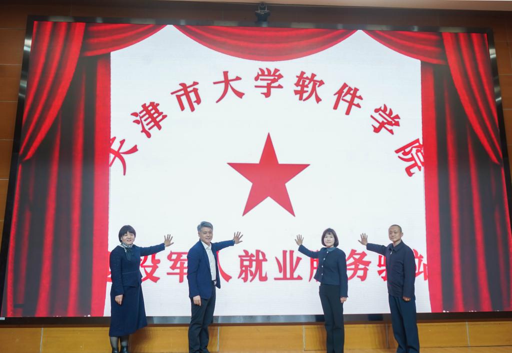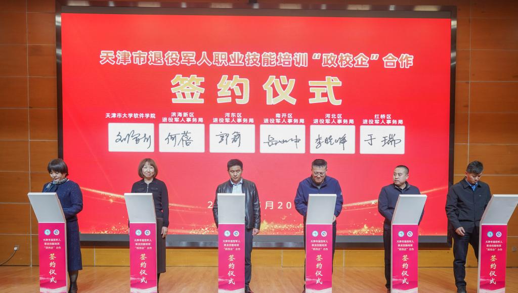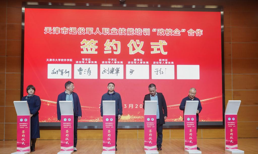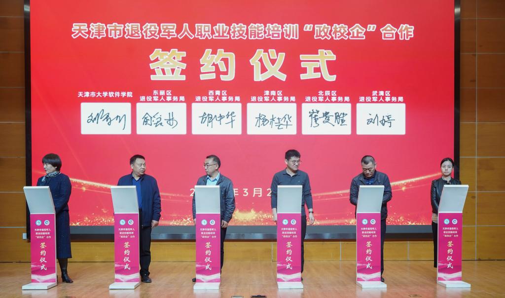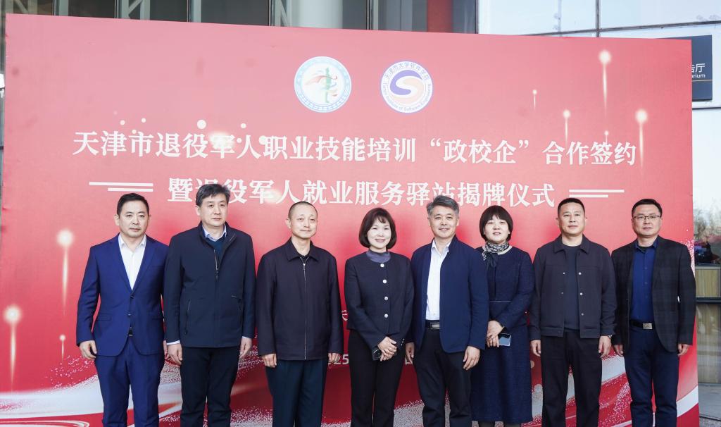 为认真落实退役军人事务部关于做好自主就业退役士兵教育培训工作有关部署,推动我市高质量发展“十项行动”走深走实,着力推进我市退役军人职业技能培训合作及退役军人就业服务工作,2025年3月20日下午,天津市退役军人职业技能培训“政校企”合作签约暨退役军人就业服务驿站揭牌仪式在我校隆重举行。天津市退役军人事务局党组成员、副局长党苗,天津市关爱退役军人协会副会长张瑞新,天津市大学软件学院校长张玉波、党委副书记张建勇、副校长刘军利,天津市各区退役军人事务局相关负责人及就业创业工作责任部门负责同志,天津市多家知名企业代表,学校教职工代表及退役军人学生代表出席了仪式。