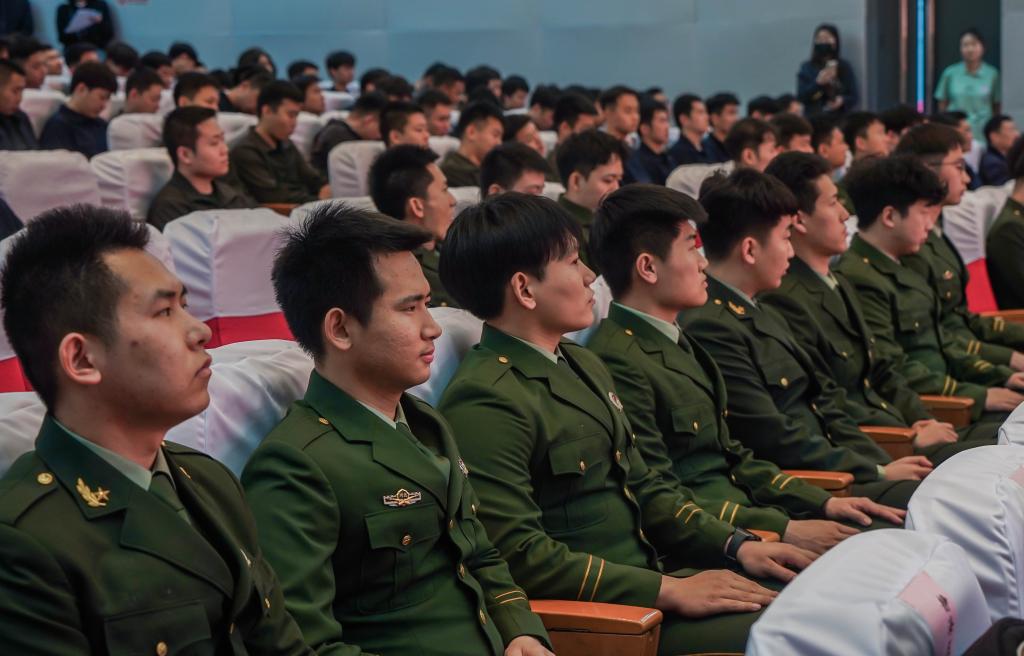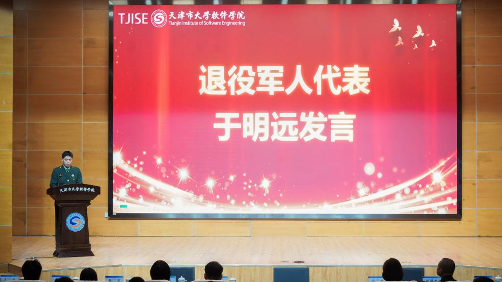 退役军人代表于明远发言。他曾服役于中国人民解放军陆军某旅,在部队期间荣获“服务保障嘉奖”荣誉称号。于明远同学表示,退役不褪色,建功新时代。他号召退役大学生士兵永葆军人本色、争当校园先锋、为学校和社会做出更多贡献。
