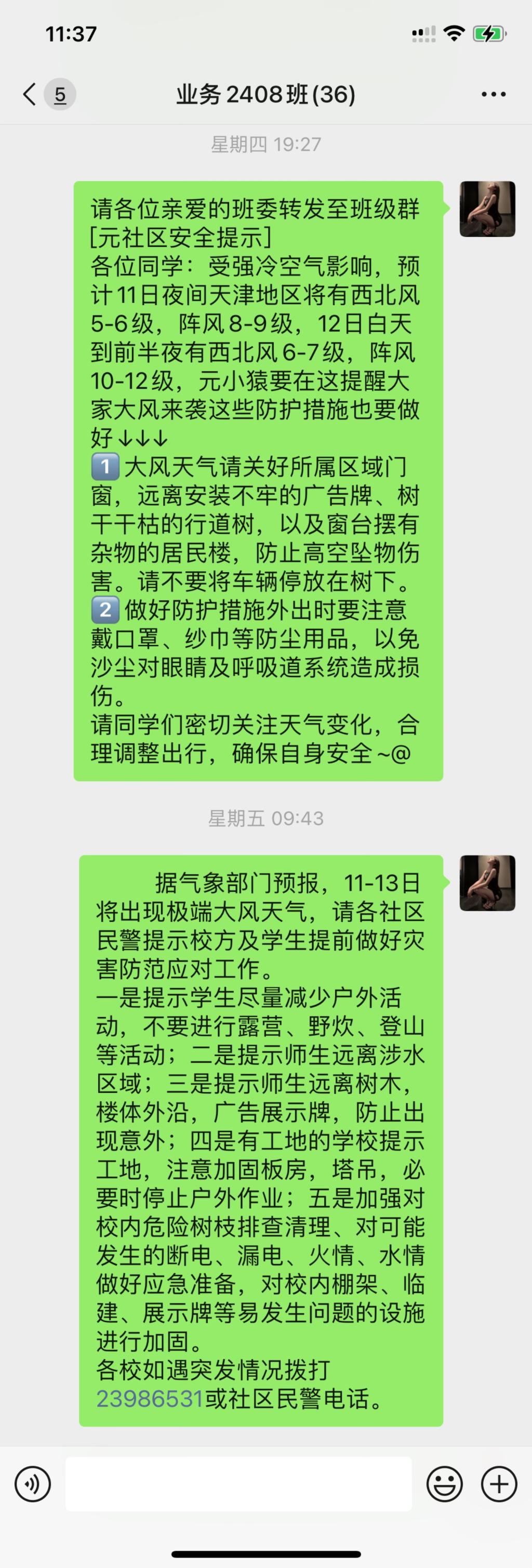 天津市气象台发布,4月11日至13日,天津将出现极端大风和降温天气。面对严峻天气形势,学校迅速启动应急响应机制,各部门迅速行动、周密部署防风抗灾工作,切实做好各项应急措施,全力保障校园安全和师生正常生活秩序。