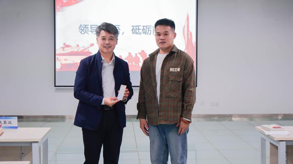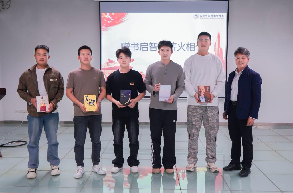 张玉波校长向学生代表赠送书籍,鼓励他们继续多读书、读好书。他指出,书香之声,青年思辨。同学们除了读文学经典书目以外,还要多读专业书、管理类以及写作类的书籍,这些知识对于在职场中脱颖而出非常重要。他强调,在天软的每位同学都要找到自己的热爱,并且坚持,一件事情只有重复到一定数量才会从量变转化为质变。要充分发挥比普通学生多一份忠诚、多一份担当的军人身份优势,保持对党和祖国的绝对忠诚,任何时候任何条件下都志坚如磐、忘我奋斗,更好地成就人生理想、实现人生价值。