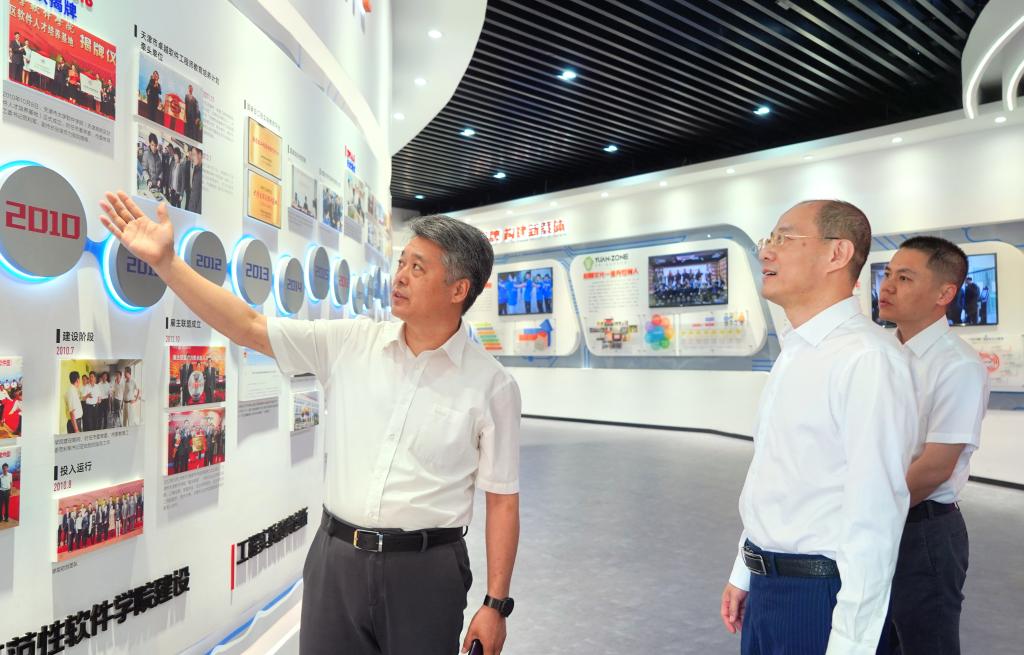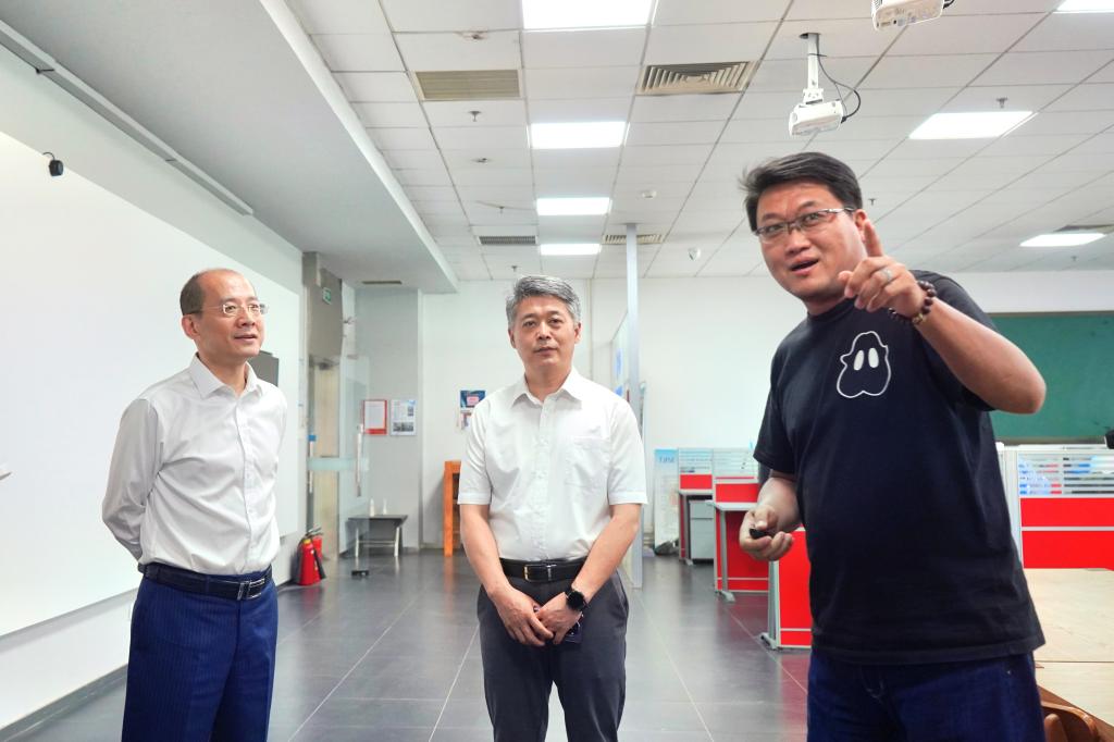 在创新成果展厅,张玉波为刘强一行详细介绍了天软的发展历程、办学理念,以及在产学研融合方面取得的丰硕成果。随后,一行人实地走访了我校国家级众创空间“创魔方”,并与协同育人企业负责同志进行了深入交流,全方位了解我校校企合作、产教融合的创新模式与实践经验。