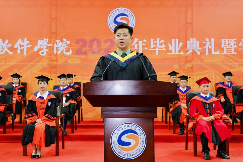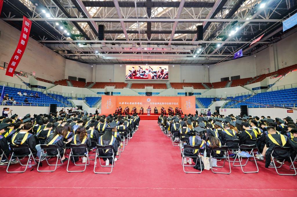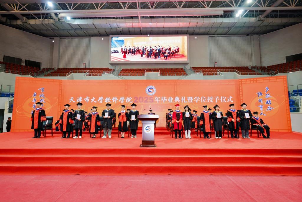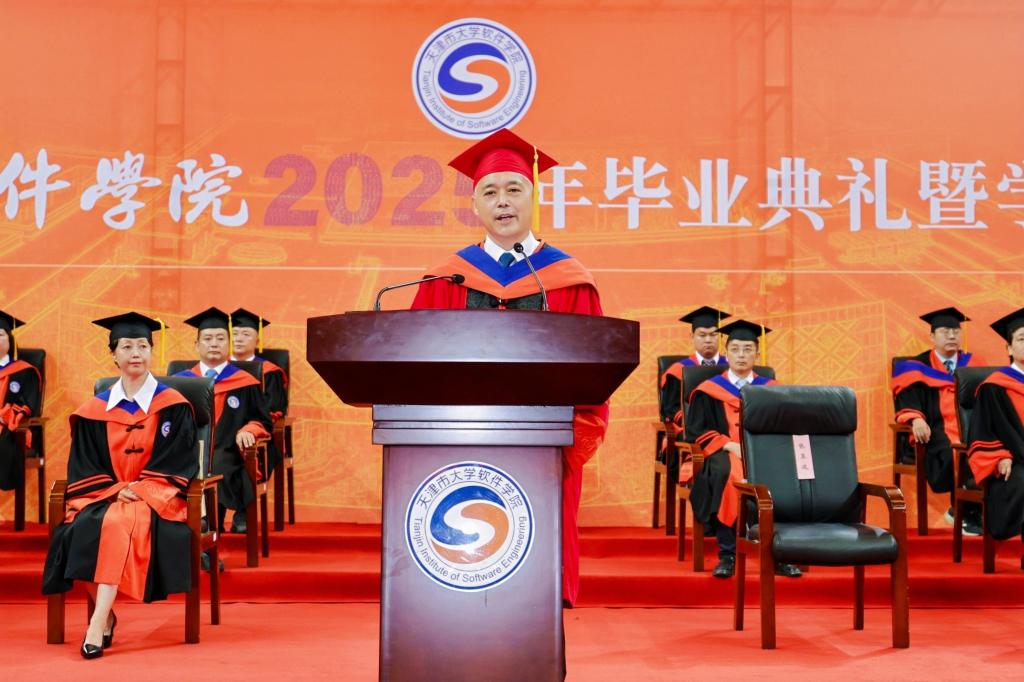蝉鸣盛夏,奏响青春骊歌;荣光六月,辉映天软华章。6月23日上午,天津市大学软件学院2025年毕业典礼暨学位授予仪式隆重举行。学校党委书记侯洁,校长张玉波,党委副书记张建勇,副校长徐俊清、纪委书记赵立志、副校长刘军利,首席科学家杨嘉琛教授,以及天津师范大学党委副书记董洪霞,天津理工大学副校长叶宁、教务处副处长李琨,天津城建大学副校长陈志华,天津农学院党委副书记宋涛,天津职业技术师范大学教务处副处长孔超,学校教指委专家委员会主任胡建平、一线工程师代表张强、学业成长引领导师代表黄军雷,协同育人企业代表郑世杰、张兵,学校各职能部门负责人、协同育人企业工程师、全体教职员工、毕业生家长代表、校友代表出席典礼仪式,共同见证全体2025届毕业生学有所成,奔赴人生的星辰大海。典礼由张建勇主持。