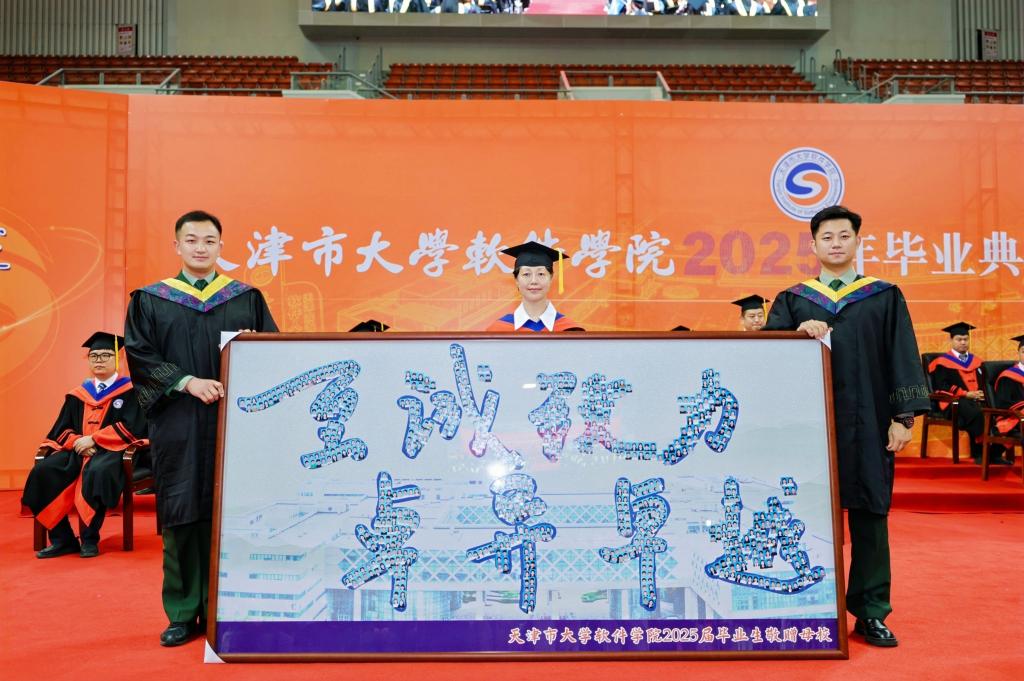 侯洁代表学校郑重接过毕业生献上的珍贵礼物——一张校训图画,“至诚致力、卓异卓越”的一笔一画由全体毕业生姓名组成。此情此景,与典礼上由全体2025届毕业生姓名构成的宏大“2025”背景墙相映生辉,深刻寓意着所有毕业生的名字,终将融入天软砥砺前行的壮丽篇章。