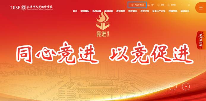 1.登录天津市大学软件学院冠通棋牌官网(https://www.tjise.edu.cn/),点击冠通棋牌主页右上方的“网上办事大厅”。