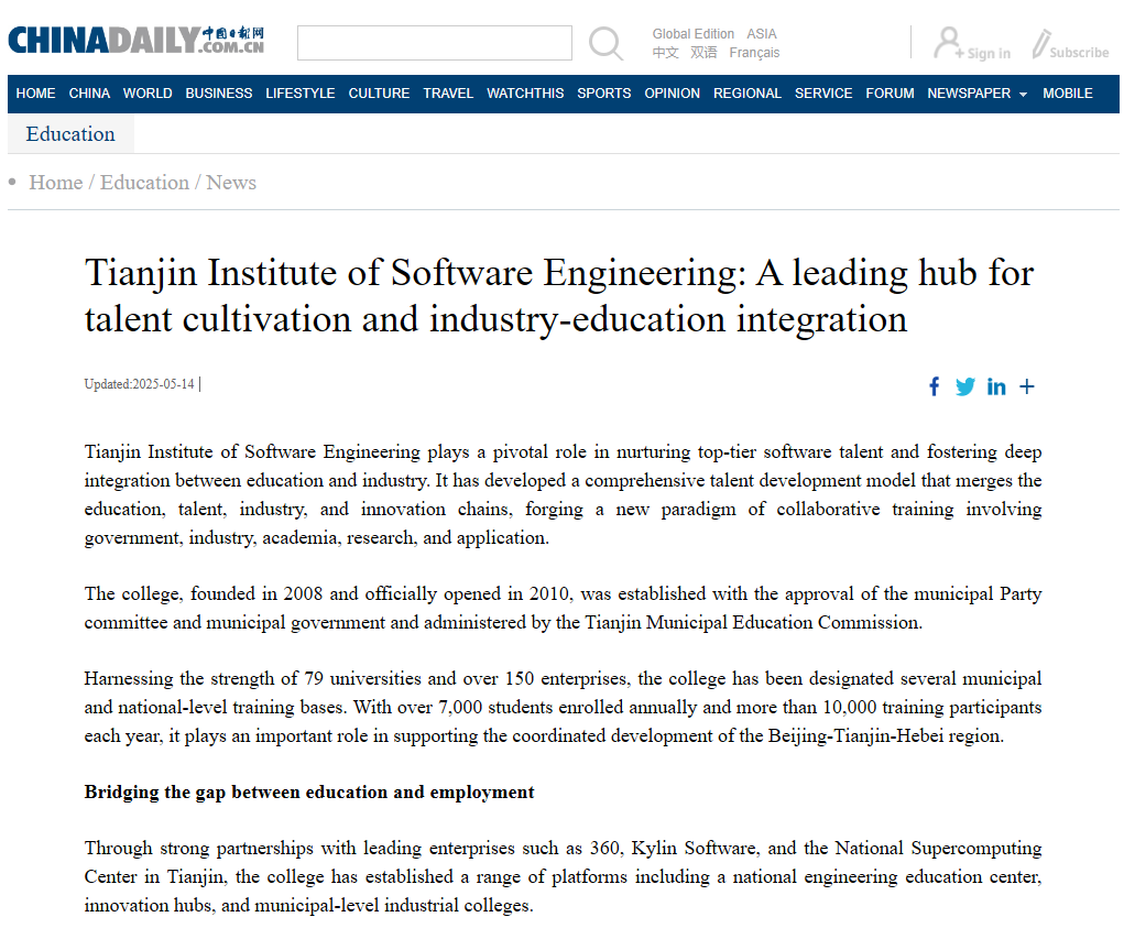 2025年5月14日,china daily以《tianjin institute of software engineering: a leading hub for talent cultivation and industry-education integration》为题对我校进行了报道。