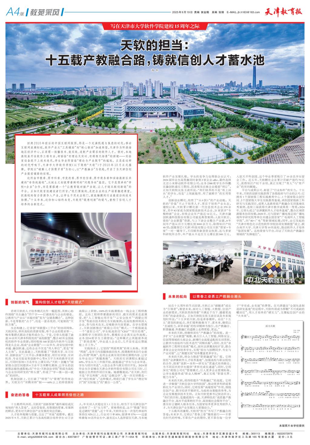 2025年9月19日,天津教育报a4版专版以《天软的担当:十五载产教融合路,铸就信创人才蓄水池》为题对我校进行了报道。