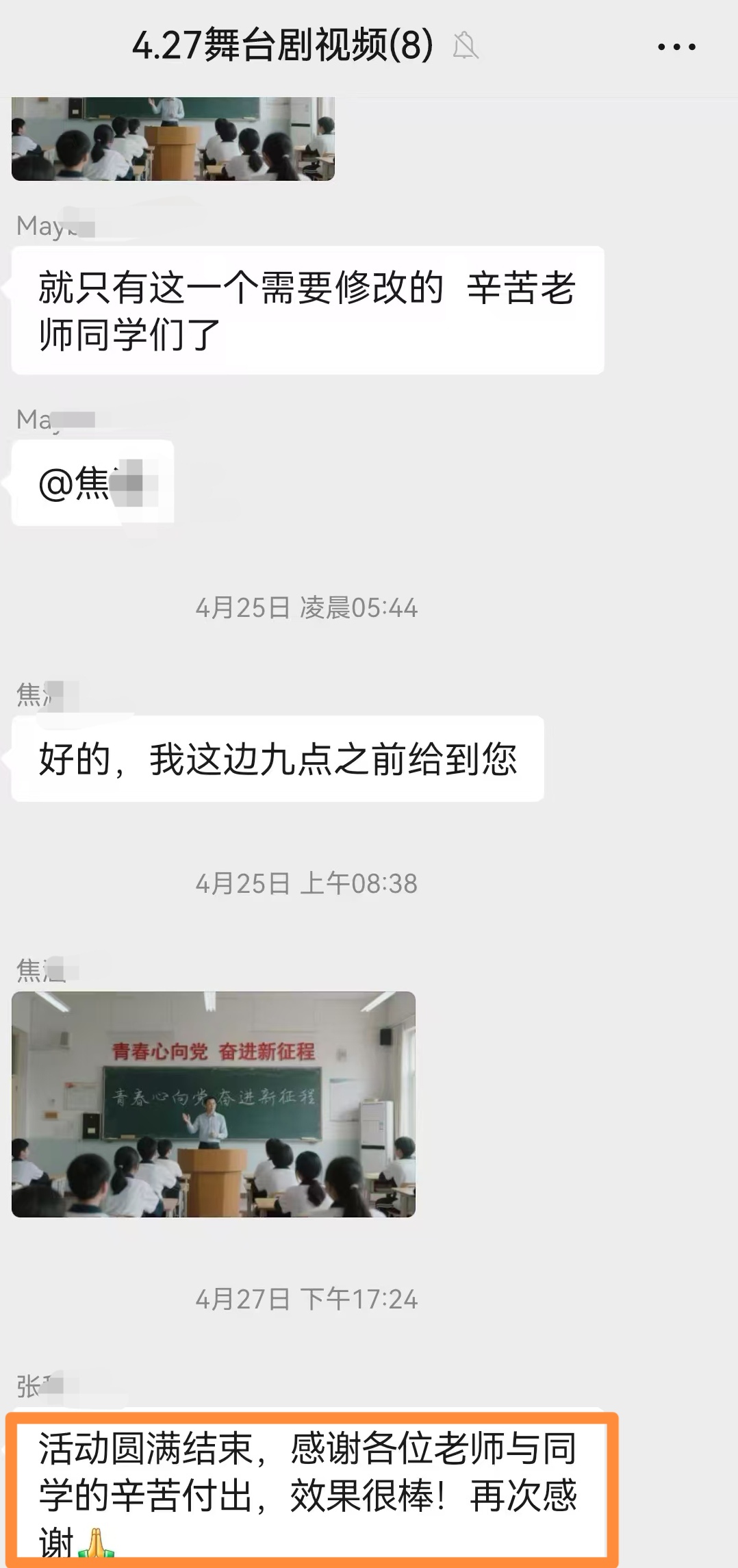 亮点有三方面,一是传承中创新。用ai生图将街道提供的历史素材二次创作,让五四精神通过ai技术焕发新生。二是协作中成长。面对海量素材的剪辑挑战,各小组高效分工,以精益求精的态度诠释“青年强则国强”的责任感。三是服务中担当。学生作品直接应用于基层文化活动,用技术助力红色文化传播,践行“请党放心,强国有我”的青春誓言。