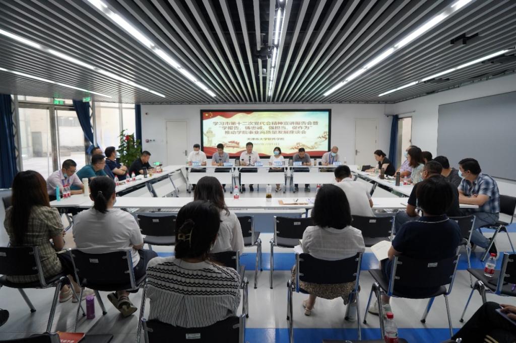 会上,党委书记张爱华结合学习宣传贯彻市第十二次党代会精神宣讲提纲,从深刻认识学习宣传贯彻党代会精神的重大意义,深刻把握党代会的主题,深刻领悟始终不渝坚定捍卫“两个确立”、坚决做到“两个维护”是天津奋进新征程、开创新局面的根本要求等方面再次讲授了专题党课。 传达了市委常委、市委教育工委书记王旭在“学报告、铸忠诚、强担当、促作为”推动高等教育事业高质量发展专题座谈会以及教育、卫生、科技、体育等领域市第十二次党代会精神宣讲报告会上的讲话精神。
