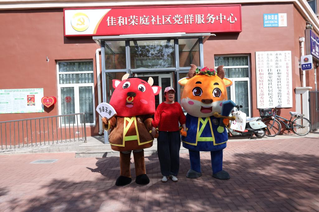 在社区工作人员的带领下,队员们深入了解了“荣庭牛”这一特色社区文化的渊源与内涵,以及背后温暖人心的邻里故事。队员们兴致勃勃地换上憨态可掬的“荣庭牛”玩偶服,体验这一文化符号的魅力。通过沉浸式互动,队员们感受到佳和荣庭社区的文化氛围,对“奉献、友爱、进步、互助”的志愿服务精神也有了更深层次的体会。